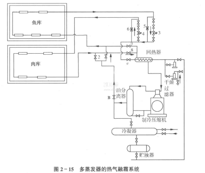 如果魚庫的蒸發盤管需要融霜時.肉庫的蒸發器應正常制冷運行。融霜的控制系統必須保證兩個蒸發器不能同時融霜。當魚庫融霜時,先關閉該庫的供液電磁閥3和回氣閥7.同時把壓縮機通向冷凝器的閥A關閉,關閉閥C,再打開閥B和閥I,打開手動膨脹閥5,使壓縮機的高壓高溫的排氣進入魚庫的蒸發盤管中,凝結下來的制冷劑液體由電磁閥4,經膨脹閥節流后進入肉庫的蒸發盤管,制冷劑吸收了庫內被冷卻物體的熱41而蒸發成氣體,由閥8經回熱器進入壓縮機。融霜結束后,按一定的順序把閥門恢復到原來的狀態。