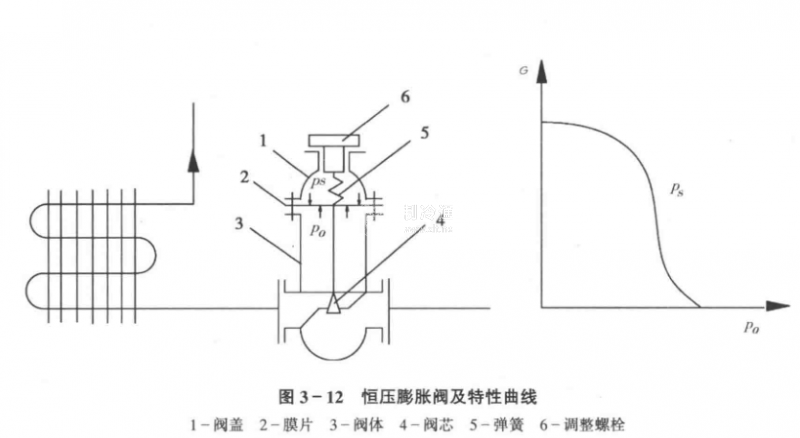 恒壓膨脹閥是依靠蒸發壓力來調節供液最的一種自動膨脹閥。圖3-12為恒壓膨脹閥的結構示意圖及特性曲線。在閥體與閥蓋之間有一膜片,膜片的下方作用有蒸發壓力Po,膜片的上方作用有彈簧的當量壓力Ps。彈簧當量壓力的大小可調,當其壓力調定后,隨著冷量負荷的變化,當蒸發壓力大于彈簧力時,閥門關閉,停止供液;當蒸發壓力降低并低于彈簧力時,閥門打開,而且蒸發壓力越低閥門的開度越大。