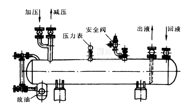 低壓排液桶如下圖所示。加壓閥接高壓排氣管,減壓閥接低壓吸氣管,回液管接冷庫沖霜回液管,出液管接至供液站。它的作用是在熱氨沖霜時,貯存由區發器或低壓循環桶過來的液體制冷劑,所以排液桶的容量應當能夠容納需要沖霜冷間中最大一間的氨液量。排液桶中存放的液體最高不得超過其容積的70%。