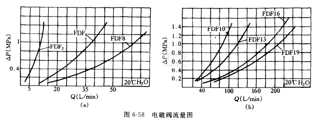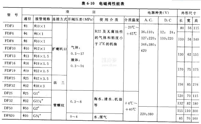 在選用電磁閥門時,首先應(yīng)根據(jù)制冷裝置所需要的流量大小來選。另外還必須注意到所選用閣門的工作電壓與電源電壓是否相符,在安裝時必須垂直安裝在水平管道上,并注意介質(zhì)流動的方向與閥門所指的箭頭方向是否一致 (切勿裝反) ,閥門前必須安裝過濾器,以防止因閥門節(jié)流孔的堵塞而造成閥門工作失靈。在具體選用時可參照流量圖即圖6-58或按表 6-10 選用。