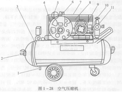 空氣壓縮機主要由壓縮泵、過濾器、電動機、帶輪、帶、帶保護罩、安全閥、壓力調節閥、壓力表、儲氣鍍和排水閥等部件組成,如圖1-28所示。電動機啟動后,動力通過帶輪傳遞到壓縮泵,壓縮泵的活塞上下運動吸入空氣,提升壓力后送往儲氣罐。進氣口處的過濾器起著過濾空氣、除去塵埃的作用,以減少壓縮泵的磨損,儲氣罐起儲存高壓空氣和緩沖的作用;壓力表顯示工作的壓力;壓力調節閥可調節輸出的壓力,使之保持在某個要求的范圍內;安全閥可保證儲氣饒的工作壓力處于設計壓力以內;排水效用于定期排放儲氣負的冷凝水。