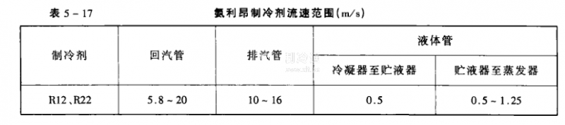 氟利昂容重較氨大,所以其產(chǎn)生流動(dòng)阻力損失較大,為減少阻力,需降低流毒,氟利昂制冷劑在管內(nèi)的流速范圍見表5-17。