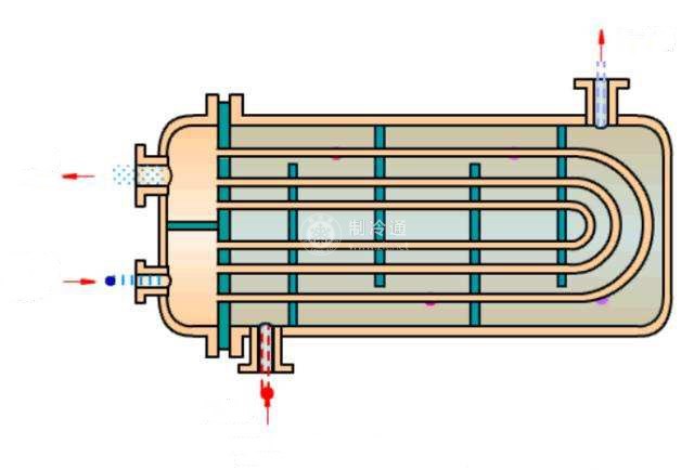 滿液式重力供液蒸發(fā)盤管布置的管道回路是立式平面布置,例如冰的貯存工程即是采用立式平面布置,多排并列的回路從分離器進液,然后回氣到分離器或集管。立式回路適合中溫蒸發(fā)溫度。低溫蒸發(fā)器要更多考慮液柱高度。因為液柱的靜壓頭使集管的底部有較高的壓力,在蒸發(fā)器較低的位置蒸發(fā)溫度會高一些,從而降低了傳熱率。