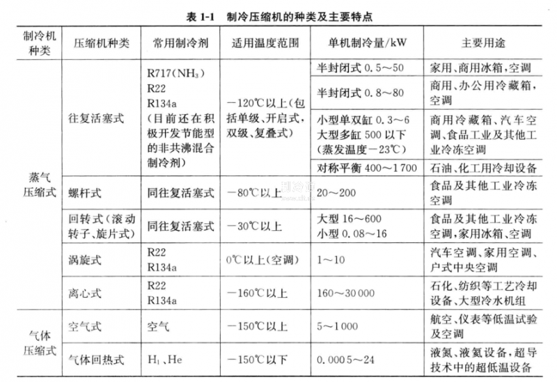 由于制冷機的應(yīng)用幾乎遍及各個領(lǐng)域及家庭生活中,為便于設(shè)計人員和制造商在各種不同情況下選用合適的配套制冷壓縮機,現(xiàn)將各種類型的制冷壓縮機的主要特點列于表1-1中。