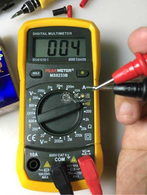 測量制冷系統(tǒng)的電阻時(shí),根據(jù)被測元件的大約阻值將轉(zhuǎn)換開關(guān)旋鈕放在適當(dāng)?shù)牧砍躺希?span>若被測元件的大約阻值為幾十歐姆時(shí),轉(zhuǎn)換旋鈕應(yīng)放在電阻擋RxI量程上,然后將表筆插入各自的插孔內(nèi)(紅色表筆插入標(biāo)有“十”號的插孔),短接表筆,檢查指針是否到“0"位;否則,旋轉(zhuǎn)調(diào)零旋鈕予以校正,最后將兩表筆各接被測元件的兩端,測量其電阻值。