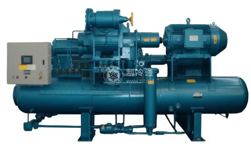 來自蒸發(fā)器的氣體首先進(jìn)入低壓級(jí)轉(zhuǎn)子,進(jìn)行吸氣、壓縮、排氣等工作過程,這與單級(jí)螺桿壓縮機(jī)相同。低壓級(jí)排出的氣體進(jìn)入齒輪箱體內(nèi),此時(shí)從壓縮機(jī)以外引入一部分低溫制冷劑蒸氣,進(jìn)入齒輪箱與之混合以冷卻低壓級(jí)排出的氣體,并且控制在一定的中間壓力下。這部分氣體進(jìn)入高壓級(jí)轉(zhuǎn)子,進(jìn)行吸氣、壓縮及排氣等過程。排出的高溫、高壓氣體進(jìn)入油分離器,開始系統(tǒng)的氣體循環(huán)過程。