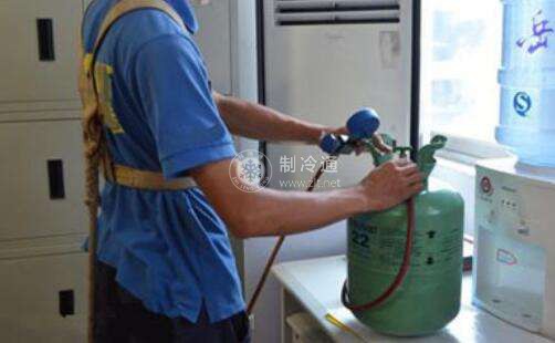 在室外機(jī)組的高壓閥(又稱液閥)的旁通孔(又稱加氟嘴)上虛接帶頂針的專用充氟軟管,然后將R22鋼瓶?jī)A斜放置在臺(tái)秤上(瓶口在下,瓶底用木塊墊起),稱出此時(shí)制冷劑鋼瓶的重量,再將臺(tái)秤的游碼向左移動(dòng)出應(yīng)充氟量的刻度,然后打開氟瓶瓶閥,當(dāng)看到有制冷劑液體從高壓閥的旁通孔與加氟管的虛接口處噴出后,迅速將虛接處擰緊。此時(shí)旁通孔上的頂針被頂開,液體制冷劑隨即進(jìn)入制冷系統(tǒng)。待臺(tái)秤平衡后,隨即關(guān)閉氟瓶閥門。為使加氟管內(nèi)存留的制冷劑液體不被浪費(fèi),可用手逐段捂一下加氟管,將管中的制冷劑液體趕進(jìn)制冷系統(tǒng)內(nèi),隨后迅速將加氟管從高壓閥的旁通孔上拆下,加氟工作結(jié)束。