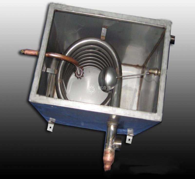 水箱式蒸發器由水箱和蒸發盤管組成,水箱由鋼板焊接而成,盤管可為立管、螺旋形盤管和蛇形盤管。氨立管式水箱式蒸發器,水箱中裝有兩排或多排管組,每排管組由上下集管和介于其間的許多鋼制立管組成,其管徑較集管要小;上集管焊有液體分離器,下集管焊有集油罐,集油罐上部接有與回氣管相通的均壓管。