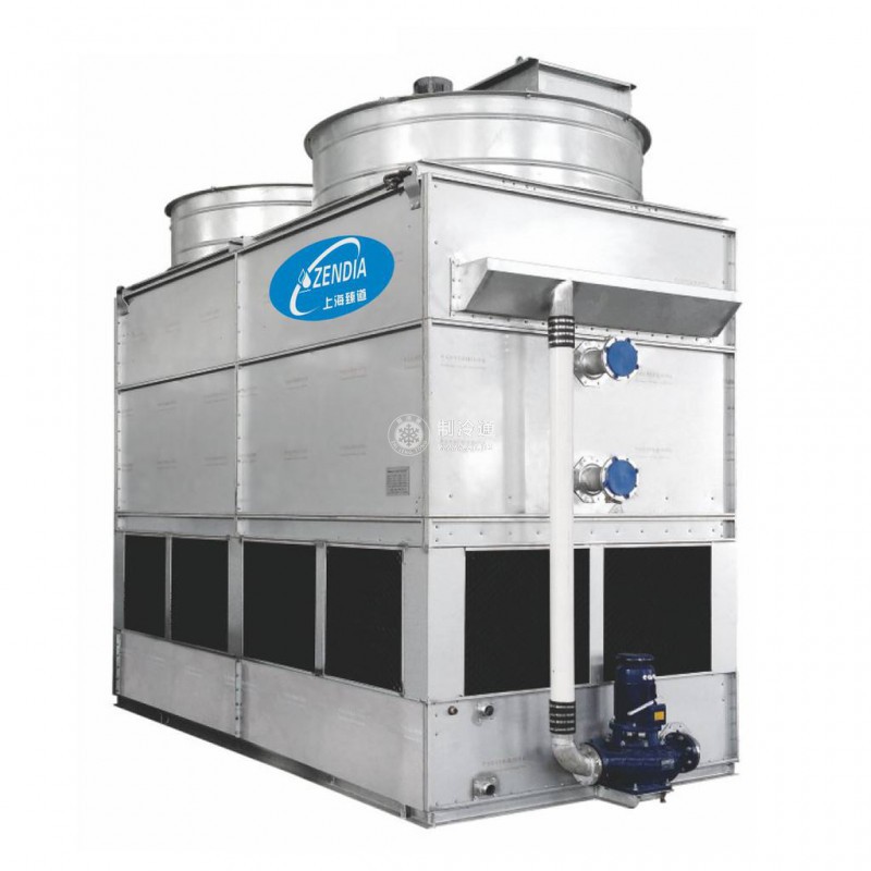 蒸發式冷卻塔:也稱閉式冷卻塔。類似于蒸發式冷凝器。當冷卻水進入冷卻塔中的盤管后,循環管道泵同時運行抽取集水池的水,經布水口均勻地噴淋在冷卻盤管表而,室外空氣在冷卻風機作用下送至塔內,使盤管表面的部分水蒸發而帶走熱量。空氣溫度較低時,本身也可以和盤管進行熱交換而帶走部分盤管的熱量,從而使盤管內的冷卻水得到冷卻。