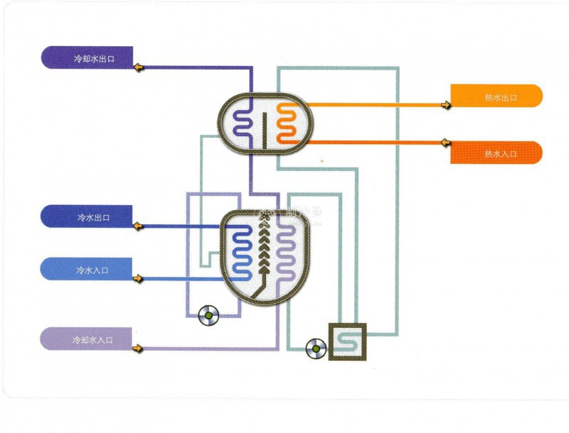 發(fā)生器中產(chǎn)生的制冷劑水蒸氣通過發(fā)生器擋液板上升到冷凝器(擋液板的作用是避免溴化鋰溶液進入冷凝器內),在冷凝器中制冷劑水蒸氣在管間流動,將熱量釋放給管束內的冷卻水。冷凝為制冷劑水,收集在冷凝器底部水盤內,靠壓力差的作用沿U形管降壓降溫后進入蒸發(fā)器, U形管相當于膨脹閥,起減壓節(jié)流作用,其高度應大于上下筒之間的壓力差。吸收式制冷機也可不采用U形管,而采用孔口節(jié)流,采用孔口節(jié)流簡化了結構,但對負荷變化的適應性則不如U形管強。制冷劑水進入蒸發(fā)器后,流入蒸發(fā)器底部水囊中,靠蒸發(fā)器泵送往蒸發(fā)器內的噴淋系統(tǒng),經(jīng)噴嘴噴出,淋灑在冷媒水管束外表面,吸收管束內冷媒水的熱量(管內的冷媒水溫度被降至7℃左右,送往需冷用戶),汽化為水蒸氣。制冷劑水蒸氣再經(jīng)過擋水板進入吸收器內,這樣可以把蒸氣中混有的制冷劑水滴阻留在蒸發(fā)器內繼續(xù)汽化,以避免造成制冷量的損失。