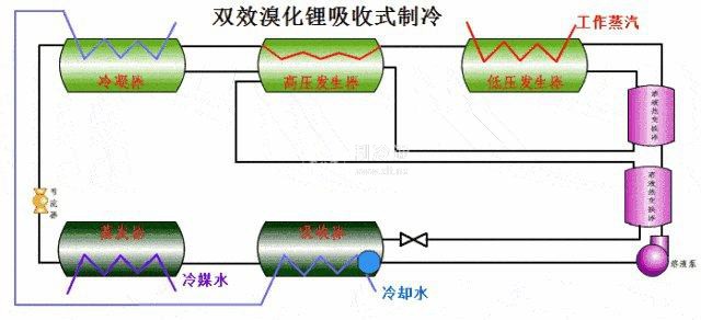 為了防止濃溶液發生結晶,單效溴化鋰吸收式制冷機的熱源溫度不能太高。單效溴化鋰吸收式制冷機主要利用低勢熱能,通常采用0.03~ 0.15MPa的飽和蒸汽或85~150℃的熱水為熱源。當有較高壓力的蒸汽或高溫水時,在溴化鋰吸收式制冷系統中增設一個高壓發生器,即有兩個發生器。高壓發生器由外界的高品位的馭動熱源提供熱童,低壓發生器則由高壓發生器中產生的高溫制冷劑水蒸氣提供熱量,有效利用制冷劑水蒸氣的凝結潛熱。驅動熱源的能量在高壓發生器和低壓發生器中得到了兩次利用,所以稱為雙效循環。這樣,一方面使進入發生器的稀溶液進行了兩次發生,獲得了更多的制冷劑水蒸氣;另一方面減少了冷凝器中的冷卻負荷(冷凝器中冷卻水帶走的主要是低壓發生器的制冷劑蒸氣的凝結熱,冷凝器的熱負荷僅為普通單效溴化鋰吸收式制冷機的一半),使機組的效率得到提高,這種溴化鋰吸收式制冷機稱為雙效溴化鋰吸收式制冷機,常見的為利用0. 25~0. 8MPa的蒸汽或150℃以上的高溫熱水作為熱源的雙效溴化鋰吸收式制冷機。