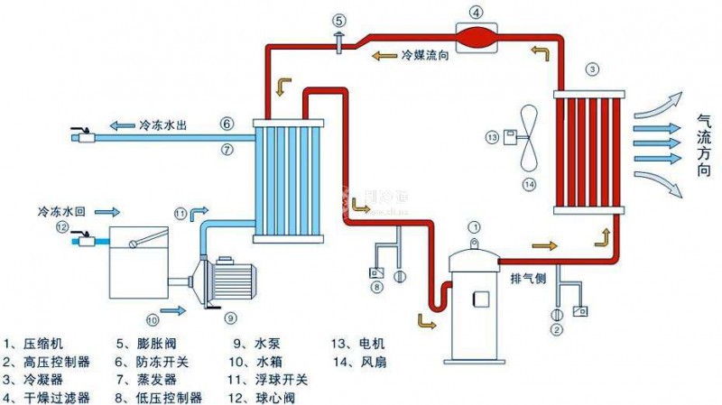 (1)關閉儲液器或冷器的出液閥(事先應將電氣控制系統中的壓力繼電器短路,以防止它的動作導致壓縮機無法運行),使壓縮機繼續運行,將系統中的制冷劑全部收集到儲液器或冷凝器中,在這一過程中讓冷卻水系統繼續工作,將氣態制冷劑冷卻成為液態制冷劑。當壓縮機的低壓運行壓力達到0(表壓)時,停止壓縮機運行。