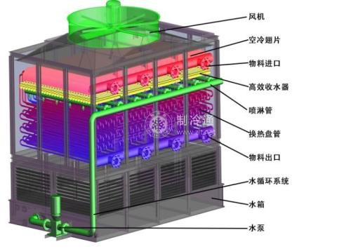 進入冷凝盤管的高溫氣態制冷劑通過盤管壁與盤管外側噴淋水和空氣進行熱交換,制冷劑氣體的溫度隨著在管內的時間加長而下降,并由氣態逐漸變成液態。用風機的超強風力,使噴淋水充分覆蓋在盤管外表面上,從而提高了換熱效率。噴淋水和空氣吸收盤管壁的熱量后溫度升高,部分水由液態變成氣態,帶走管壁上大量熱量,而濕熱空氣中的水分被擋水板截住引入PVC熱交換層中,熱空氣排出。