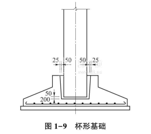 單獨基礎是柱子墓礎的主要類型。單獨基礎所用材料由柱子的材料和荷載大小而定,通常采用灰土、磚、混凝土和鋼筋混凝土。如采用裝配式鋼筋混凝土柱時,在基礎上應預留安放柱子的孔洞,孔洞尺寸要比柱子橫截而尺寸大一些。柱子放入孔洞后,在柱子周圍用比基礎孔洞混凝土標號高一級的細石混凝土灌縫。這種叢礎又叫杯形墓礎,如圖1-9所示。