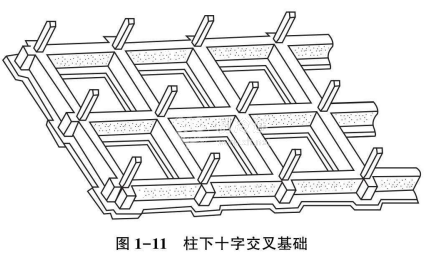 (2)柱下十字交叉基礎。建在高壓縮性地基上,荷載較大的高層框架結構房屋,為了增加房屋的整體性、減少基礎的不均勻沉降,常將基礎做成十字交叉基礎。其型式如圖1-11所示。