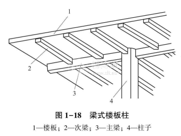 1)梁式樓板柱 柱的頂端支撐主梁,主梁支撐次梁.次梁支撐樓板,荷載由主梁傳給柱子,如圖1-18所示。