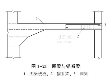 3)圈梁 冷庫(kù)的外墻雖然不承受其他荷載,但高度較大,多層冷庫(kù)可高達(dá)幾十米。為了增加墻體的穩(wěn)定性,在外墻高度方向上每隔一定距離做一連續(xù)不斷的圈梁加固。圈梁的位置除頂層墻頂和基礎(chǔ)頂面設(shè)置外,一般每層設(shè)一道,標(biāo)高與樓板平,并用錨系構(gòu)件與樓板拉結(jié)。如圖1-21所示。