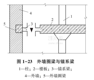 為防止隔熱層內(nèi)產(chǎn)生冷凝,凡穿過(guò)墻身的錨接件(錨系梁)、管線(xiàn)等(圖1-23所示為外墻圈梁與錨系梁示意圖),其外而必須用軟木等高效率的隔熱材料包裹,并應(yīng)做好該局部的隔氣層加固處理。