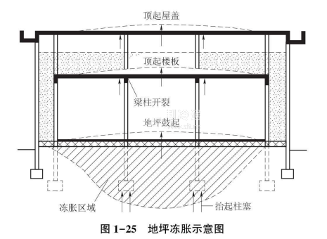 由于凍結的土壤周圍的水蒸氣分壓力比尚未凍結的土壤中的水蒸氣分壓力低,因而促使未凍結的水分通過毛細管作用移向已凍結的土壤。于是,土壤越凍越深,越凍越快,凍土深度超過基礎的脹面,就會把基礎頂起,造成上部結構的破壞。