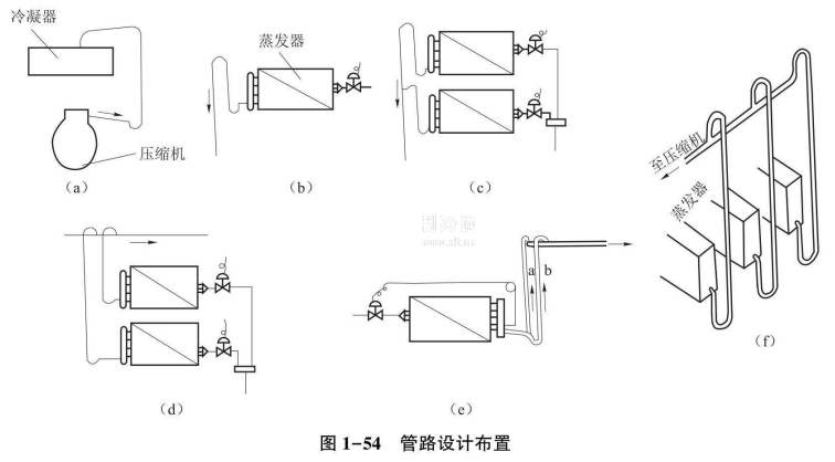 如制冷機負荷增加時,氣流速度增大,破壞油封,使制冷劑從a與b管同時上升流向壓縮機,而不致氣流速度過大,導致壓力損失過大。當多臺蒸發器并聯使用時,為了不因某一個或數個蒸發器的負荷變化而影響到其他蒸發器的正常工作,可采用如圖1-54 (f)所示的連接方法。