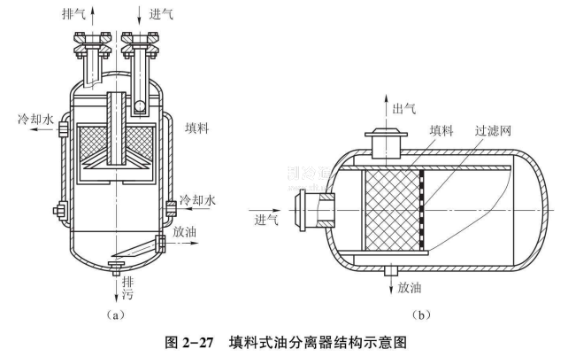 (2)填料式油分離器。圖2-27所示為填料式油分離器的結構。在分離器中有一層填料,填料可用不銹鋼絲、陶瓷環或金屬切屑等,其分離效果以不銹鋼絲為最佳。制冷劑蒸氣通過油分離器的填料層后,把潤滑油分離出來,分離器內的蒸氣流速應在0.5m/s以下。填料式油分離器也可以臥式安裝。填料式油分離器的效率較高,但是阻力較大。