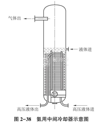 如圖2-38所示的中問冷卻器用于一級節流、中問完全冷卻的氨雙級壓縮制冷系統中。其結構特點是:進氣管從桶體頂部封頭伸入桶內,一直往下浸沉在正常氨液面下150~200mm,以保證低壓排氣能充分被洗滌冷卻。進氣管下端開口焊有底板,以避免進氣直接沖擊桶底,將潤滑油沖起。桶上部兩塊多孔傘形擋板可分離蒸氣中的液滴。進氣管液面以上的管壁上開有一個壓力平衡孔,它可以避免停機時氨液進入氨氣管道。已冷卻的蒸氣從上部側面的出氣管去高壓壓縮機。一組蛇形盤管設羚于桶體下部,從儲氨器來的高壓氨液被管外中間溫度的氨液冷卻。桶上排液管與排液桶或低壓循環桶連接。桶上還有放油管、壓力表、安全閥及液位指示器等各種管接頭。中間冷卻器必須包隔熱層。