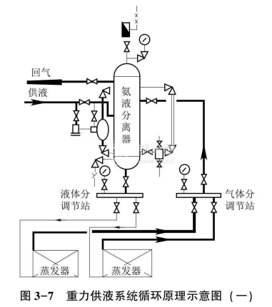 圖3-8所示為重力供液系統循環原理示意圖,從機房來的高壓氨液經浮球閥進人氨液分離器,然后由氨液分離器的出液管進人蒸發器。回氣則在氨液分離器內進行氣液分離,然后從吸人管返回壓縮機。氨液分離器與蒸發器之間可產生程度不同的再循環。