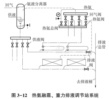 圖3-12所示為熱融霜、重力排液調節站系統。融霜時熱氨蒸氣從回氣管進入蒸發器,而氨液及積存在蒸發器和供液管內的潤滑油,則從供液管的末端排向排液總管。