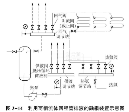 圖3-14所示為融霜時液體從兩相流體回程管排入低壓循環儲液捅的系統原理圖。融霜時關閉供液閥,打開熱氨閥,使熱氨氣進入蒸發器,液氨則從兩相流體回程管排入低壓循環儲液桶。這種裝置以及融霜操作都比較簡單。
