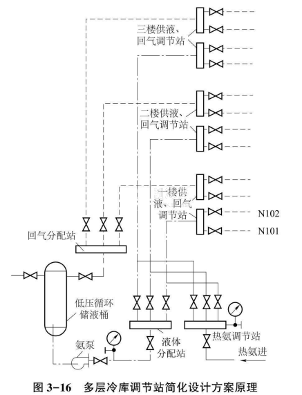 現代大中型冷庫,單間容量較大,每層樓冷藏間的間數較少,一般采用光滑排管作為庫房冷分配設備,平常以掃霜為主,采用熱氨融霜的次數不多。因此,各層的調節站和融霜裝置的設計可以適當簡化。