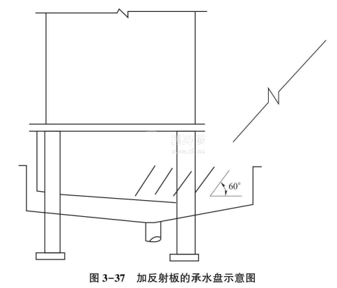 怎樣防止水滴外濺,需要考慮的因素比較多。自蒸發(fā)器下沿至承水盤底板之間的高度過大是沒有好處的。只要回風口斷面合乎要求,則不要加大這個高度。如果把承水盤設計成為V形,利用斜面將水滴向水盤中央反射回去,對減少水滴外濺是有幫助的,但承水盤高度將加大,整個冷風機以及凍結間的空間高度將隨之加大??梢圆捎靡环N加反射板的承水盤,如圖3-37所示,這種做法將利用斜面和控制承水盤高度尺寸的矛盾統(tǒng)一起來了。