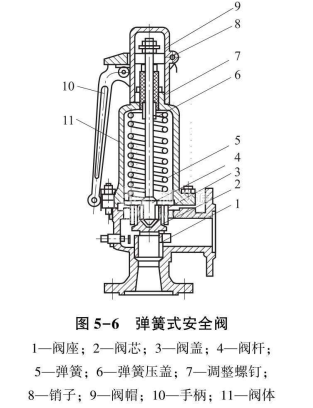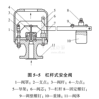 安全閥的結構。杠桿式安全閥(見圖5-5)主要由閥芯、閥座、杠桿和重錘等部分組成。它是利用重錘的重量通過杠桿的作用,將閥芯緊壓在閥座上,使承壓容器內的壓力保持在允許范圍內。如果氣體壓力超過了重錘通過杠桿作用在閥芯上部的壓力,則閥芯就被頂起,離開閥座,氣體即從排氣口排出。排氣壓力大小的調節是通過改變重錘與杠桿支點間的距離來實現的。