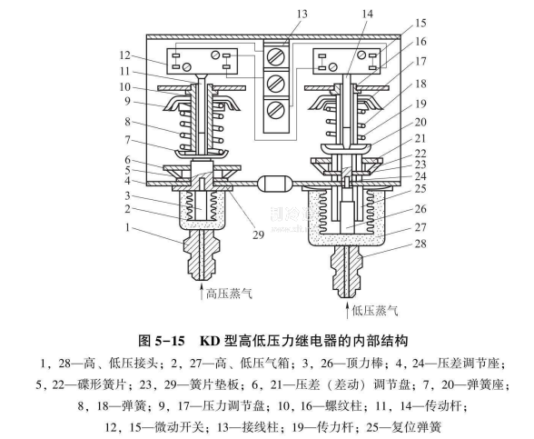 KD型高低壓力繼電器的內部結構如圖5-15所示。