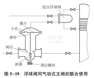 在大型制冷裝置中還可將非直通式浮球閥用作感應(yīng)機(jī)構(gòu),氣動(dòng)式主閥為執(zhí)行機(jī)構(gòu),共同實(shí)現(xiàn)對(duì)供液最的調(diào)節(jié),如圖5-19所示。氣動(dòng)主閥的動(dòng)力元件為膜片,當(dāng)蒸發(fā)器內(nèi)的液位較低時(shí)浮球閥處于工作狀態(tài),使膜片上方的空間與高壓側(cè)接通(但中間經(jīng)過浮球閥閥孔的節(jié)流),于是膜片下曲,通過推桿使閥芯下移,閥孔被打開,液體經(jīng)節(jié)流進(jìn)入蒸發(fā)器。氣動(dòng)主閥的開度隨著膜片上方的壓力而變,故屬于比例調(diào)節(jié)。當(dāng)蒸發(fā)器中的液位升高到一定限度時(shí),浮球閥關(guān)閉.膜片上方的空間同高壓側(cè)斷開,其中存留的液體經(jīng)小孔流下,膜片上下的壓力平衡,于是在彈簧的作用下氣動(dòng)主閥關(guān)閉。彈簧的彈力可用調(diào)定螺絲來調(diào)定。