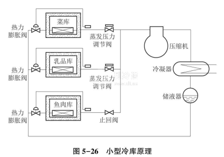 如果在高溫庫(kù)不安裝蒸發(fā)壓力調(diào)節(jié)閥,則各蒸發(fā)器都只能在同一蒸發(fā)壓力(低溫庫(kù)的蒸發(fā)壓力)下工作,即很容易引起高溫庫(kù)中冷藏食品的變質(zhì)和干耗增大。