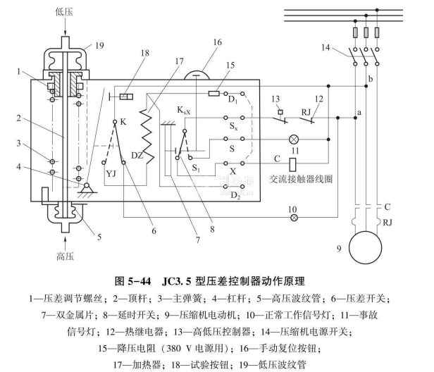 當壓差小于給定值時,杠桿順時針偏轉(處于虛線位置)使開關K與YJ接通,正常工作信號燈熄滅,電流由b點經K, YJ、加熱器D1、X、Ksx, Sx再回到a點,此時壓縮機仍能運轉,但電加熱器接通電后發熱,加熱雙金屬片,約經過60s后,雙金屬片向右側彎曲程度隨時間增加而逐漸增大,直至能推動延時開關Ksx與S1接通,這樣就切斷了交流接觸器線圈與加熱器的電源,使交流接觸器脫開,壓縮機停止運轉,事故信號燈亮,同時加熱器停止加熱。