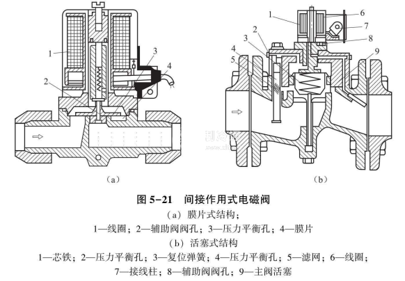 圖5-21所示為兩種間接作用式電磁閥的結構圖,如圖5-21 (a)所示的主閥為膜片式結構,它適用淡水或海水介質。如圖5-21(b)所示的主閥為活塞式結構,它的工作原理是:當線圈接通電源時,產生磁場,吸起芯鐵,輔助閥閥孔被打開,使活塞上部空間與閥后相通,此空間內的壓力迅速下降至閥后壓力,由于閥后壓力低于閥前壓力,故在活塞上下形成了一個壓力差,從而使活塞向上移動,閥門被打開;當線圈電源被切斷時,磁力消失,芯鐵在彈簧力和自重的作用下,下落關閉輔助閥閥孔,此時閥前介質通過活塞上的平衡小孔進入活塞上部空間,使上部空間壓力等于閥前壓力,活塞在彈簧力和白重的作用下,下移關閉閥門。