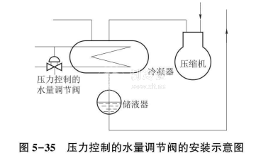 圖5-34所示為一種受壓力控制的水量調節閥,它在制冷系統中的安裝如圖5-35所示。它的工作原理是:閥上部有連通管連接到冷凝器,以感受冷凝壓力的變化。如果冷凝壓力升高,閥的波紋管就被進一步壓縮,使上頂桿和下頂桿下移,將閥門開大,增大冷卻水量,從而使冷凝壓力降低,恢復到給定伎范圍;反之,如果冷凝壓力下降,則閥門關小,減少冷卻水量,讓冷凝壓力回升到給定值范圍。