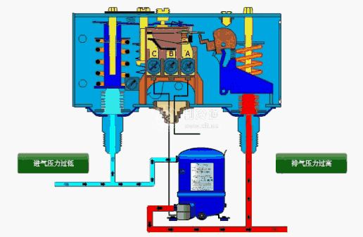另外在壓縮機啟動時,在延時時間以內(例如不到60s),雖然已經加熱雙金屬片,但因彎曲不足,延時開關尚未動作,故壓縮機仍在運轉,事故信號燈不亮,但因開關已脫離觸頭DZ而未和觸頭YJ相接觸,所以短時間內正常工作信號燈也會不亮。在壓差控制器正面裝有試驗按鈕,可隨時測試延時機構的可靠性。