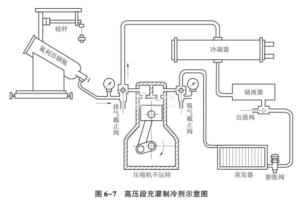 除了吸入閥多用孔道充注制冷劑方法外,也可將氟利昂液體直接由排出閥多用孔道充入系統。這種方法的優點是灌注速度快而安全,適用于系統內抽成真空第一次灌注制冷劑的情況,如圖6-7所示。灌注時鋼瓶位置應比系統的儲液器高,靠鋼瓶內的制冷劑與系統之間的壓力差與高度差自行進入系統。當系統內壓力高于0. 3 MPa時,應停止在高壓側充液。若充注量不夠,則可改為吸入側充注制冷劑蒸氣。采用高壓側充注氟利吊時,切不可啟動壓縮機,并注意排氣閥不能漏泄,否則會產生液擊。