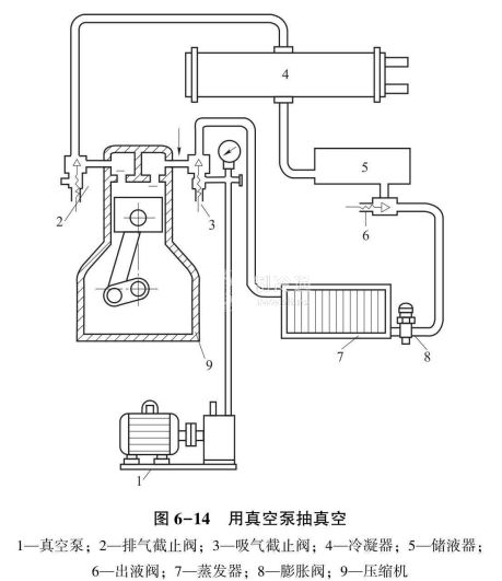 2.氟利昂制冷系統的真空試漏(采用真空泵抽真空,如圖6-14所示)