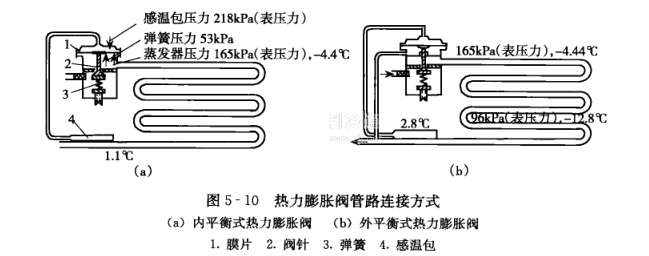 熱力膨脹閥由蒸發器出口處的溫度控制,根據結構和接受信號的不同,可以分為內平衡式和外平衡式兩種,管路連接方式如圖5一10所示,內平衡式熱力膨脹閥連接一個感溫包,感溫包裝在蒸發器出口處,用以感受蒸發器出口處的溫度。與蒸發器出口處溫度相對應的壓力作用在膜片的一側,蒸發器入口處的制冷劑蒸氣壓力和彈簧壓力作用在膜片的另一側,膜片與閥針相連,可以調節制冷劑的流量。當蒸發器的負荷增大時,出口蒸氣過熱度增加,膜片上部壓力變大,于是閥針下移,有更多的制冷劑流入蒸發器,從而降低出口處的過熱度;反之亦然。外平衡式熱力膨脹閥增設了一條外部連接管,將膜片下部空間與蒸發器出口連通,即膜片下部的制冷劑蒸發壓力就不是蒸發器的進口壓力和彈簧壓力之和,而是蒸發器的出口壓力與彈簧樂力之和。這樣使膨脹閥所提供的過熱度與燕發器出口處的飽和溫度相適應,解決了由于蒸發器存在壓力損失,導致內平衡式熱力膨脹閥開啟過熱度增大、蒸發器傳熱面積的利用率降低的問題,外平衡熱力膨脹閥可避免出現較大的過熱度,適用于蒸發器阻力較大的制冷系統。
