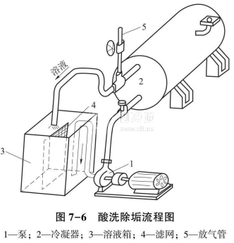 酸洗法除水垢,適用于立式和臥式殼管式冷凝器,尤其適用于銅質(zhì)冷凝管。其工作原理如圖7-6所示,把5%~10%的稀鹽酸溶液儲(chǔ)存在耐酸儲(chǔ)液槽內(nèi)。開啟耐酸泵,把溶液加入冷凝器的水管內(nèi),強(qiáng)制循環(huán)20~30 h,使鹽酸和碳酸鈣、碳酸鎂等產(chǎn)生化學(xué)反應(yīng),生成的氯化鈣和氯化鎂溶于水中,并放出二氧化碳?xì)怏w。清洗后的溶液流入沉降槽內(nèi),經(jīng)過濾除去機(jī)械雜質(zhì),然后溶液通過溢流管流回儲(chǔ)液槽,繼續(xù)循環(huán)使用。