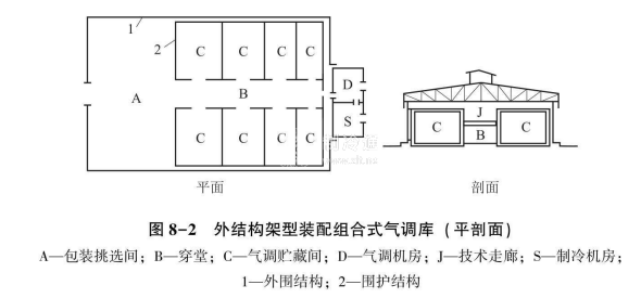 圖8-2所示為較典型的氣調(diào)庫主體構(gòu)造示意圖,地坪以上建筑包括外圍結(jié)構(gòu)和圍護(hù)結(jié)構(gòu)兩部分。外圍結(jié)構(gòu)由鋼柱、鋼梁等組合的鋼結(jié)構(gòu)架和屋面板、外圍板等組成;圍護(hù)結(jié)構(gòu)即庫體,由“三明治”板裝配而成。外圍結(jié)構(gòu)主要起保護(hù)圍護(hù)結(jié)構(gòu)的作用,并能改善圍護(hù)結(jié)構(gòu)的熱工性能;圍護(hù)結(jié)構(gòu)則具有隔熱和氣密的功能。