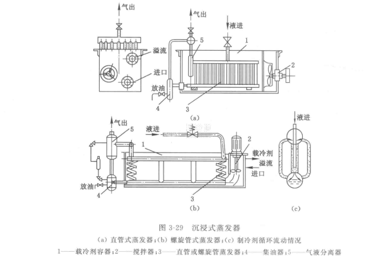 沉浸式蒸發器是由一組垂直布置的平行管組成的蒸發器,如圖3-29所示。制冷劑在管內蒸發,整個組沉浸在盛滿載冷劑的箱(池或梢)體內,載冷劑在攪拌器的推動下在箱內流動以增熱。由于箱體不承壓,載冷劑只能做開式循環,因此不能用揮發性液體作載冷劑。目前廣泛用于氨制冷系統。蒸發器全部用無縫鋼管焊制而成,主要由立管、箱體、攪拌器、氣液分離器、集油器、閥件和管路等組成。立管與上、下集管焊成一體,中間立管較粗,兩側立管較細。氨液從中間立管的進液管迅速進入下集箱,然后沿側立管上升并吸熱蒸發;蒸汽經上集箱匯總后進入氣液分離器,然后返回壓縮機;液滴則經中間立管返回下集管供繼續蒸發。當以水為載冷劑時,可將水冷卻至0℃以適用于空調系統;當以鹽水為載冷劑時,可將水冷卻至-20~-10℃,適用于鹽水池制冰或食品的冷加工。目前,它們在生產中的應用都很廣泛。