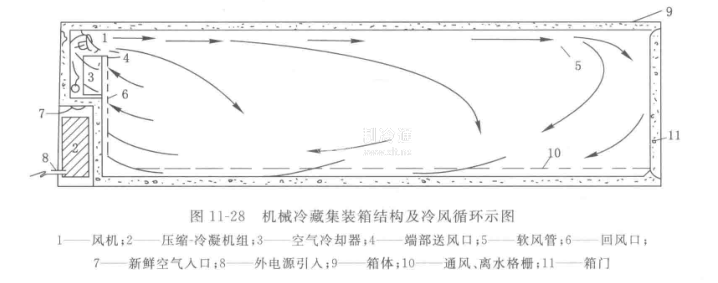 機械式冷藏集裝箱不僅有制冷裝置,而且具有加熱裝置,可以根據需要采用制冷或加熱手段,使冷藏集裝箱的箱內溫度控制在設定的溫度范圍內。一般機械式冷藏集裝箱的箱內控制溫度范圍為-38~-18℃。