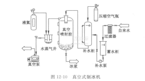 真空制取冰漿的裝置如圖12-10所示,包括真空霧化腔室、供水系統(tǒng)和抽真空系統(tǒng)。真空式制冰機將水霧化噴入真空絕熱腔室,在水滴表面形成的水蒸氣被連續(xù)地抽出。水蒸氣從水滴中吸收蒸發(fā)潛熱,從而使水滴溫度平穩(wěn)地下降,直至水滴形成冰晶。冰漿的IPF可通過改變真空腔室的真空度和噴嘴的數(shù)目實現(xiàn),霧化噴嘴平均直徑為50 um,噴射角為60°,在噴射壓力為810 kPa下的噴射流量為2-10 L/h,真空腔室高1.33m,以致水滴在腔室內(nèi)停留的時間不超過0.002 s,制冰所用的水為含7%乙烯的乙二醇水溶液。