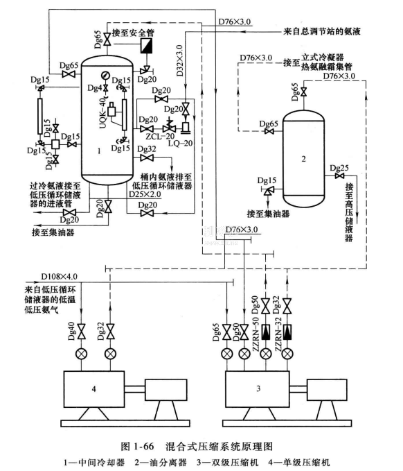 混合式制冷壓縮系統由單級壓縮機、雙級壓縮機、油分離器和中間冷卻器組成,混合式壓縮系統原理圖如圖1-66所示。一般在壓縮機和冷凝器之間設置油分離器,防止壓縮機排出的潤滑油大量進入系統,影響系統制冷效果。中間冷卻器用于雙級壓縮制冷系統,其作用是使低壓級排出的過熱蒸氣被冷卻到與中間壓力相對應的飽和溫度,以及使冷凝器后的飽和液體被冷卻到設計規定的過冷溫度。為了達到這個目的,可向中間冷凝器供液,使之在中間壓力下蒸發,吸收低壓級排出的過熱蒸氣與高壓飽和液體所需要移去的熱量。
