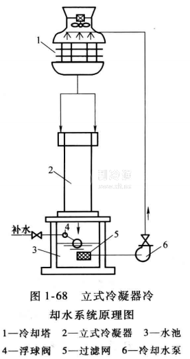 如圖1-68所示,該方案只需一個水池、一個循環水泵,冷卻塔布置在立式冷凝器的上方,冷卻水從冷凝器頂部的配水箱流入換熱管中,并在重力作用下以螺旋線狀沿管道內表面成膜層自上而下,與管外過熱氨氣換熱后流入水池,水再由水泵送上冷卻塔冷卻后,循環使用。