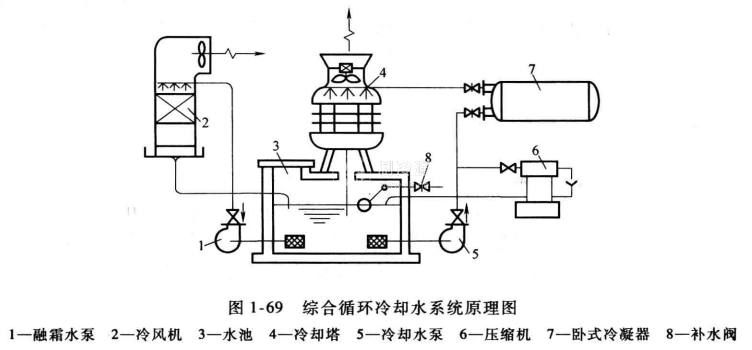 如圖1-69所示,該方案把冷凝器冷卻水、壓縮機氣缸套冷卻水和冷風機融霜用水共用一個水池,實現綜合循環用水,耗水量較小,是較好的冷卻水系統布置方案。